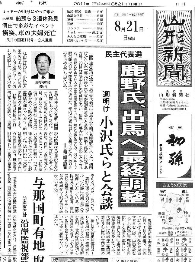 政局が一段と複雑にそして不透明になってきた。 この中で右顧左眄をせず、じっと構えてきた鹿野議員に対する次期首相への 期待感が高じてきたことは我々の読みのとおりである。 我々にとっても何とか菅首相の後継者になっていただきたいという期待感は 大きいものがある。 8月21日の地元山形新聞の第一面にもこの件がトップ記事となった。 地元の関心も日々高まっている。 戻る