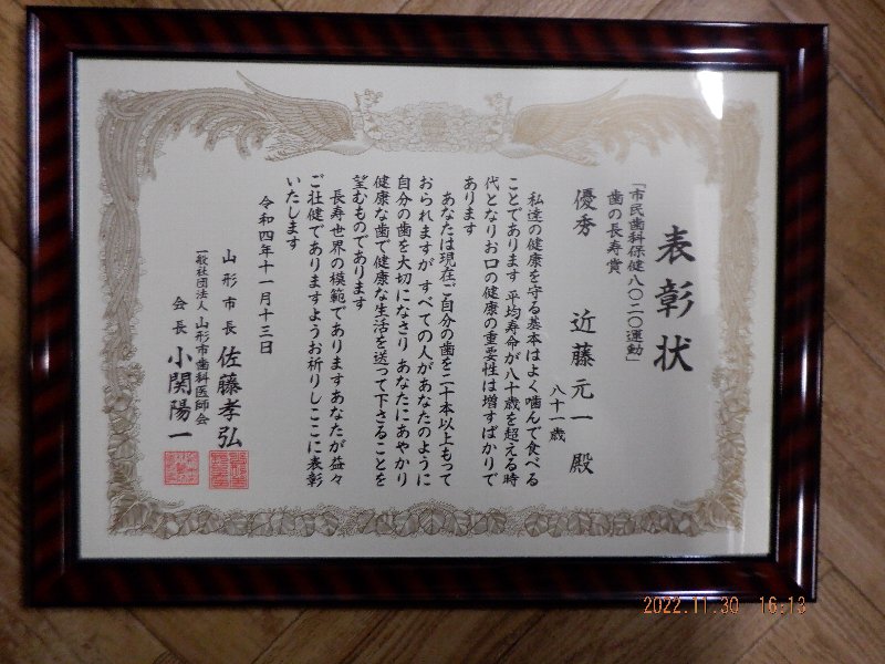 実は、わたくしも昨年、令和3年11月21日付けで8020の表彰を受けております。