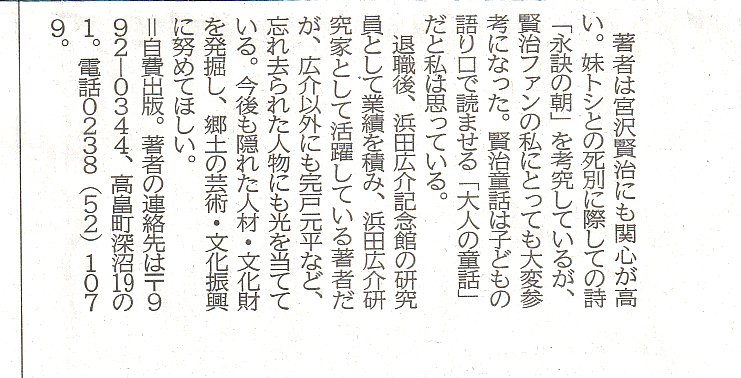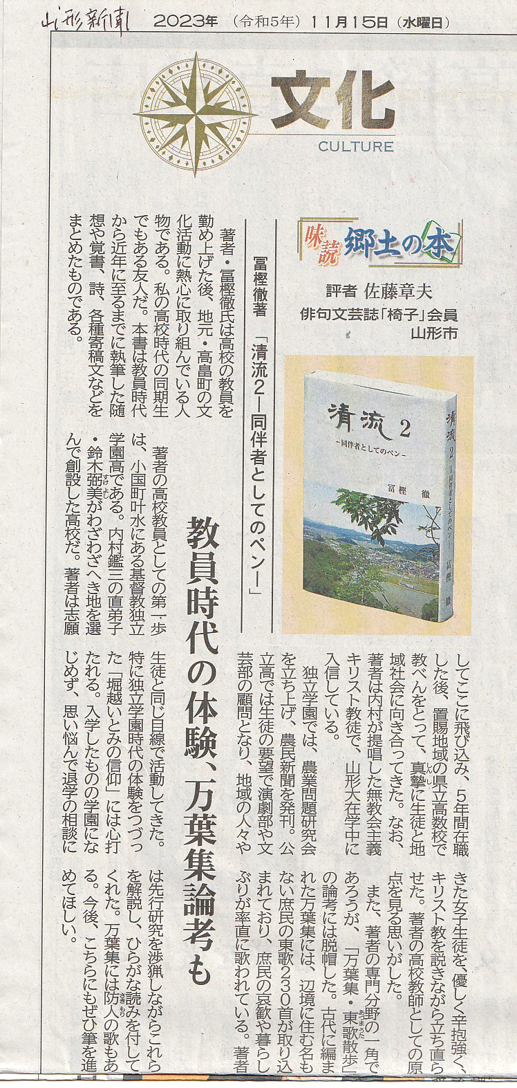 「清流-2」に関する書評が佐藤 章夫氏の手によって山形新聞の文化欄に