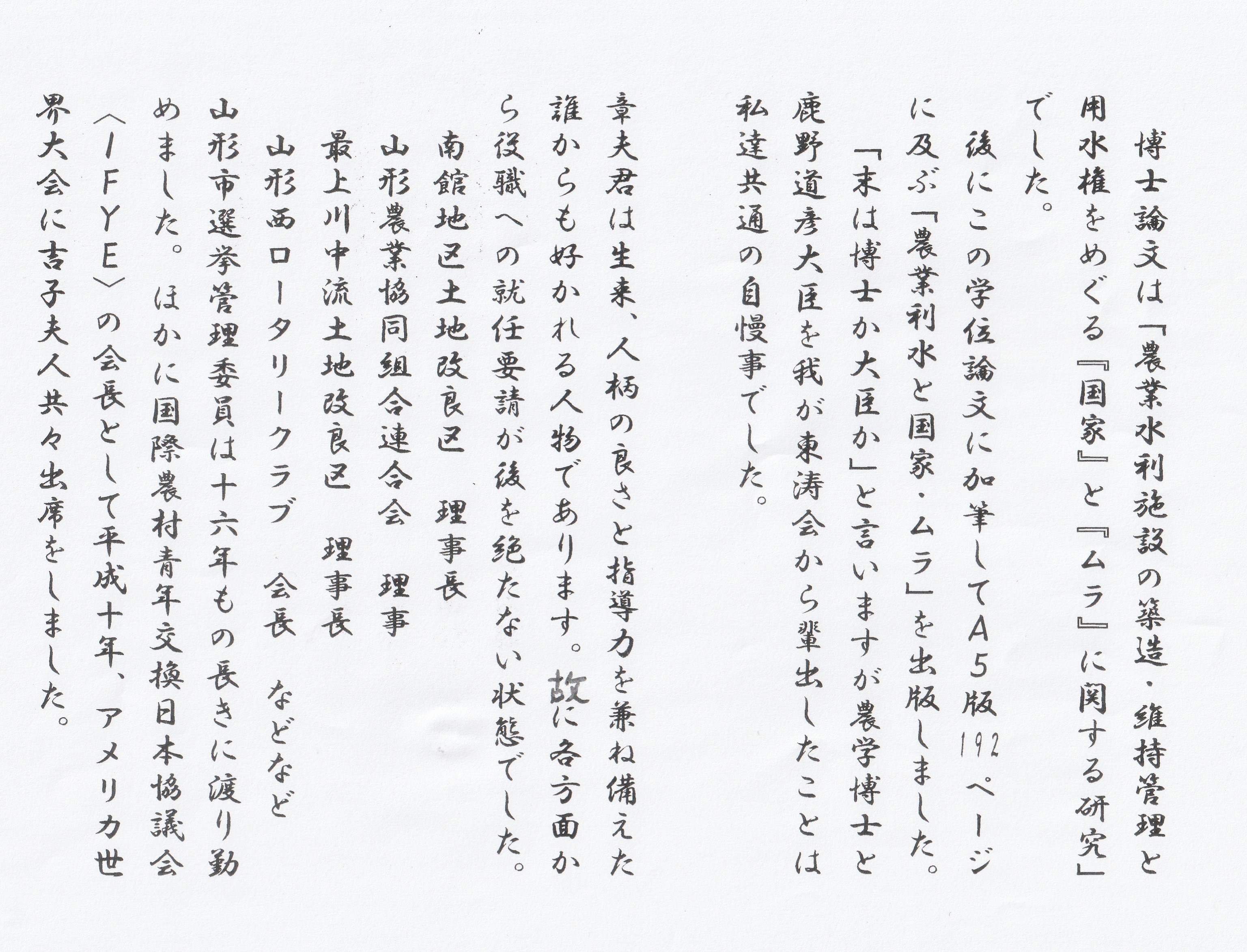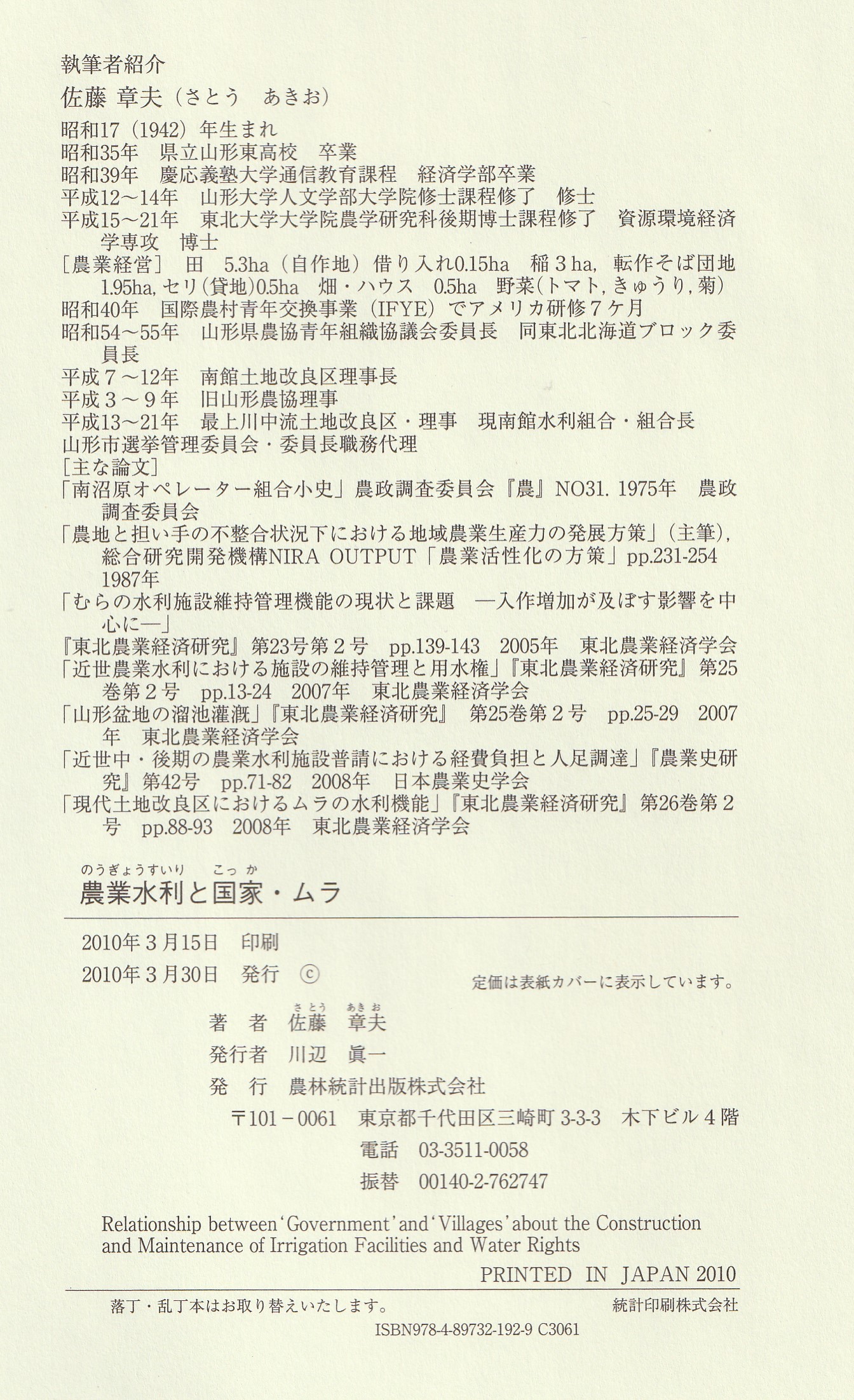 参考に彼の経歴を自身が出版された書籍「農業・水利と国家・ムラ」に掲載されている