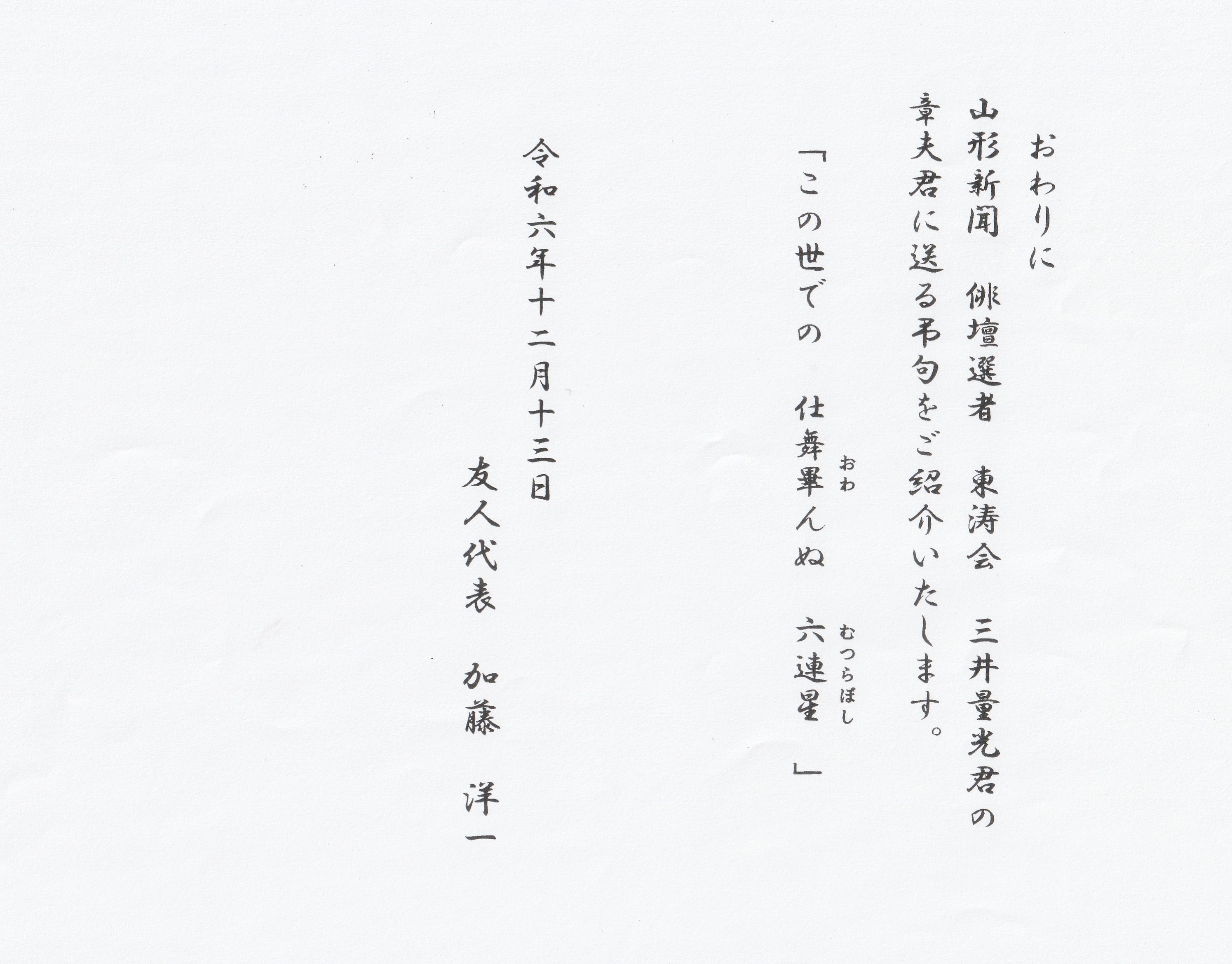 葬儀においては友人代表として加藤洋一氏から弔辞が捧げられました。