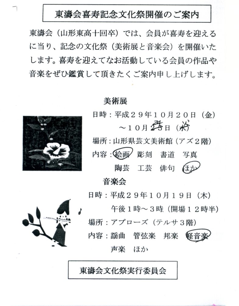 東濤会喜寿記念文化祭開催の案内ハガキ 標記の会の案内ハガキを用意して配布していますが、まだ見ていないという 方も多いので改めて掲載しますのでご承知下さい。 なお、私の手元に新しいハガキが無くなってしまい手元の古い版のものを もとにして紹介しておきます。ご容赦下さい。 文面中〇で囲まれたところは私が出品か出場をする項目になりますので 無視して読んで下さい。 戻る
