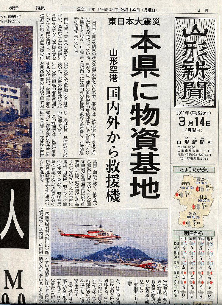 平成23年3月14日の山形新聞に一面のトップに東日本大震災に おける被災地への供給物資の集積基地と指定された記事が出ていた。 本県は幸いにも比較的被害が少ない立場であった。 そこで全国からの救援物資を山形空港を使い物資基地としての任務を 果たすこととなった。 その記事についての写真を次に紹介する。 何とかこのような支援活動を通して被災者の皆さんの負担を少しでも軽くすることが出来れば と願っています。 戻る