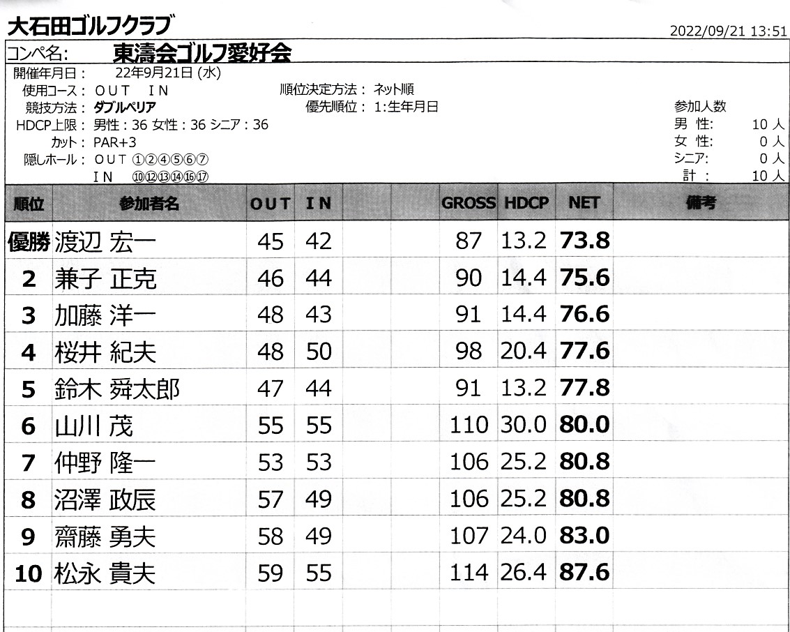 さて、肝心の成績は次のとおりである。会長が3位につけて頑張っているの