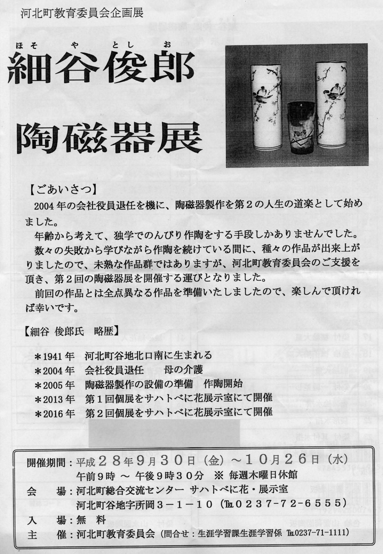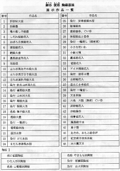山形東濤会会員 細谷俊郎君の個展開かる 細谷俊郎君の個展が開催されています。 同君の腕は益々上がり、繊細で緻密な作品を沢山生み出しており、 独自の境地を開いていると評価されています。 現在、下記案内のような要領で個展が開かれています。 ぜひ、ご覧いただき励ましの言葉をかけていただければと思います。 作品目録をも掲載しておきます。 鑑賞の参考にして下さい。 戻る