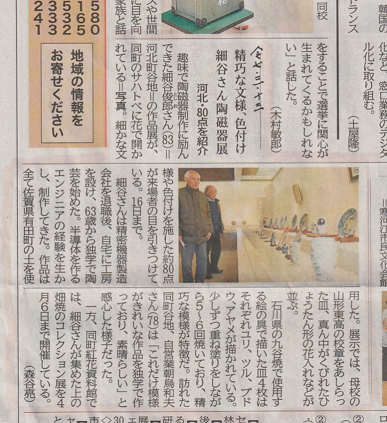 3月13日の山形新聞に谷地で開催している彼の陶磁器作品展に関する