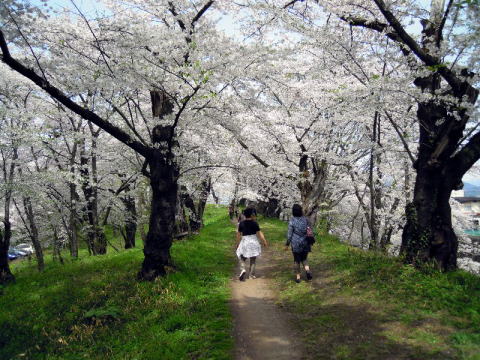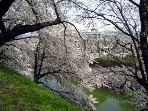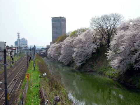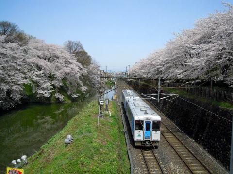 霞城公園の桜の特徴は城の堤と堀、そして電車線路とが調和して