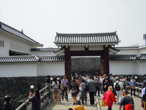 霞城公園の入り口の大手門の周辺は何時も混んでいる。