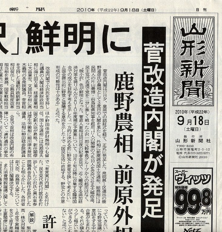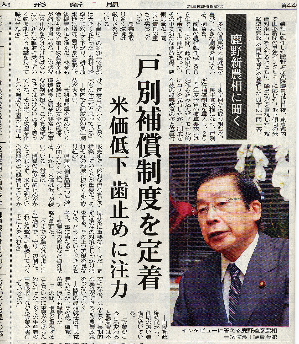 鹿野大臣の抱負を述べた山形新聞の記事も紹介する。