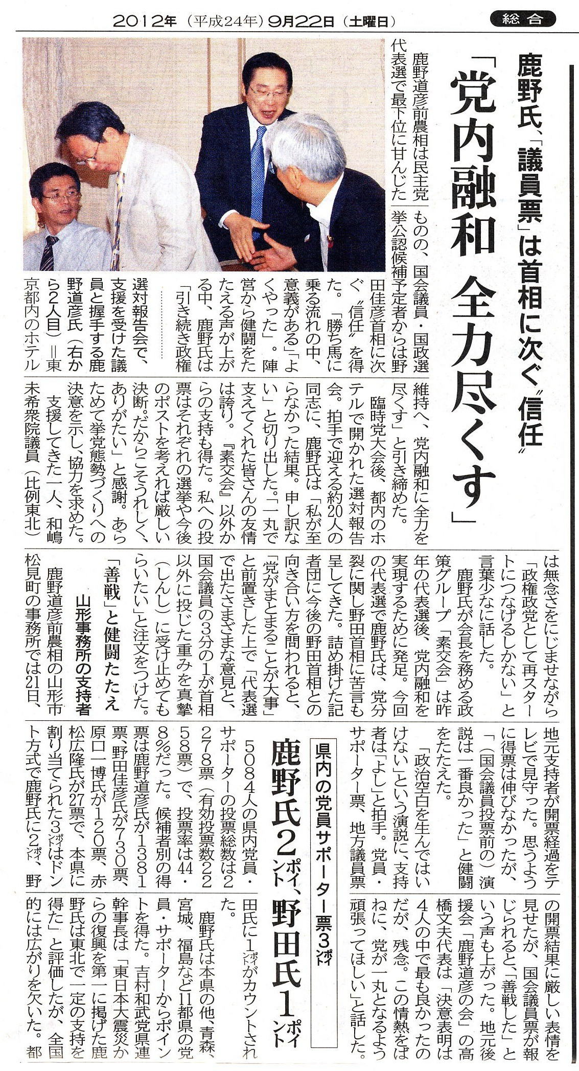 鹿野道彦議員大健闘す 平成24年9月21日 民主党代表選挙が行われ野田氏の再選が決定したが 我らの代表鹿野道彦君も候補の一人として大いに頑張ってくれた。 結果は残念な結果であったが中身は堂々としたものであった。 特に最後の演説は大変熱が入ったものとなったが多くの人は久しぶりに 代議士らしい演説を聞いたと話題になったとのことだがもっともである。 さて、選挙の次の日の新聞(山形新聞)に掲載された記事を紹介する。