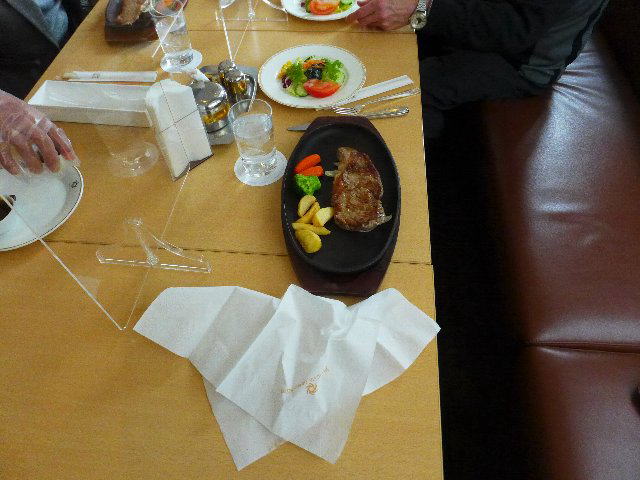 結構大きいステーキが出た。もちろん、ご飯、サラダが付き、パン、コーヒー、スープは