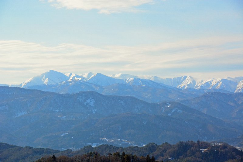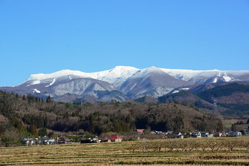 中間層の山々の右端の白い筋が坊平スキー場、左端の白い筋群が蔵王スキー場