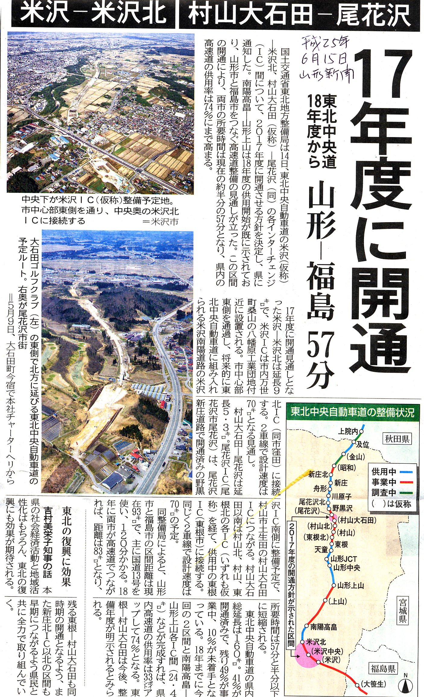 さて、山形新聞6月15日版に県内高速道路の現状と今後の進捗に関