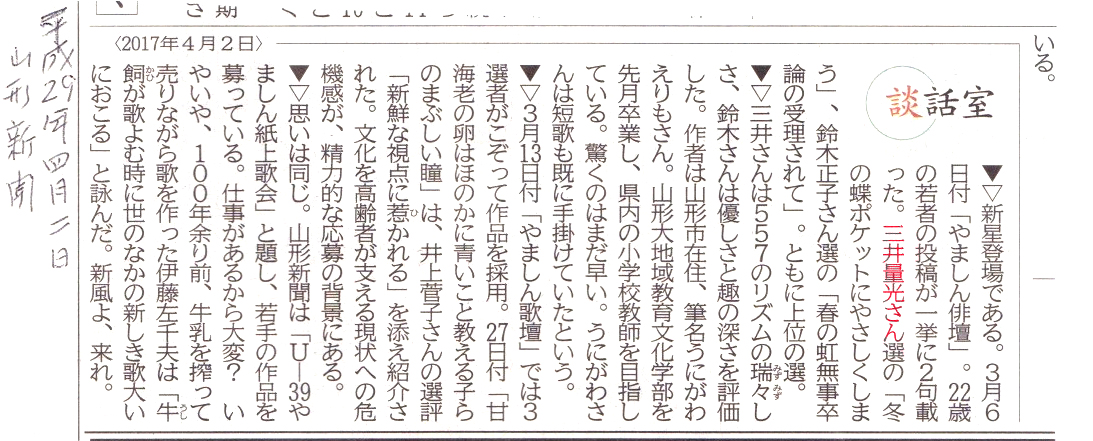 三井君記事最新版紹介 平成29年4月2日の山形新聞紙面の談話室というコーナーを読んでいたら 三井量光という文字が目につきすぐに読んでみた。 このような引用例に彼の業績が使われるとはすばらしい。 ぜひ皆さんに紹介したい思い記事にします。