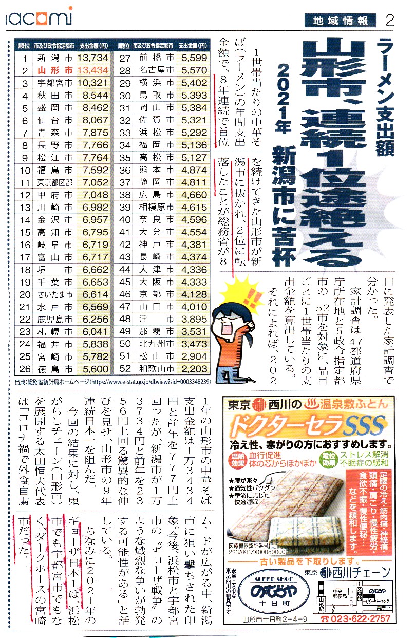 これまでラーメン代の支出額の第一位は山形市が長く続けていたが2021年の
