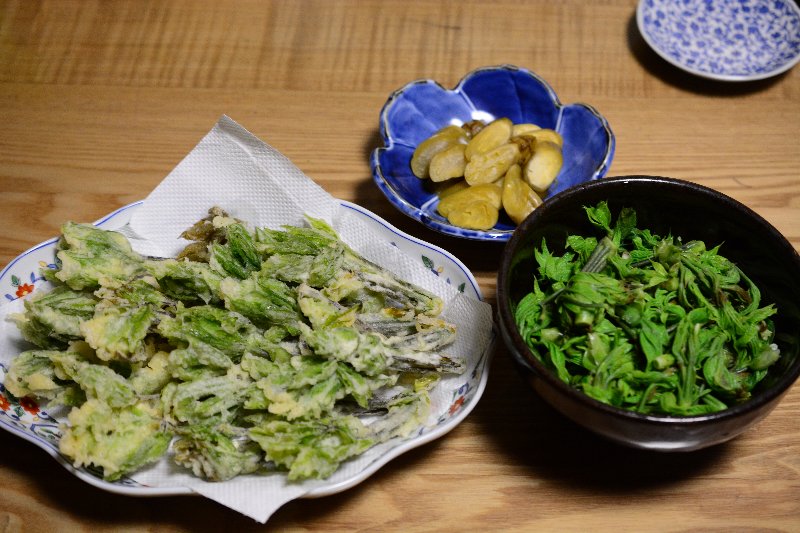 写真はコシアブラのてんぷらとおひたし、うしろのものはペソラ漬である。