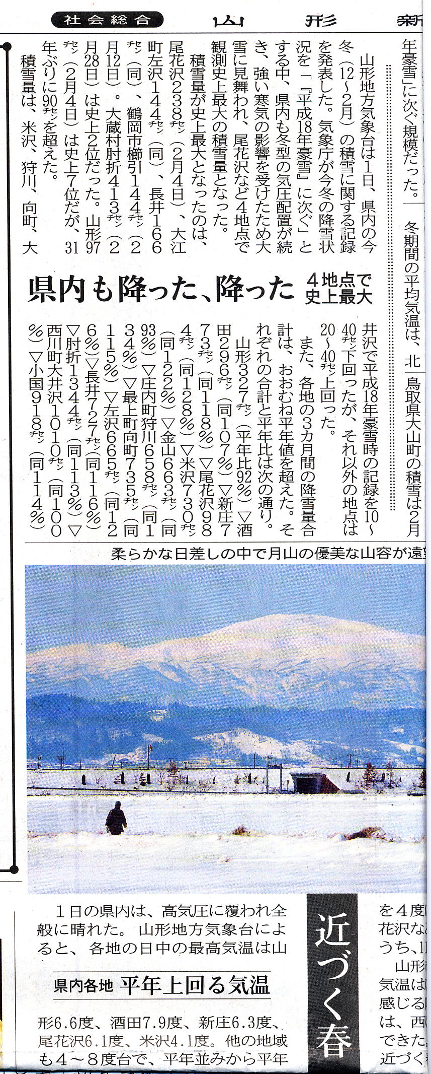 今冬積雪に関する数値が何回も発表された。しかしデータに対してはどう も疑問がある。 山形市の積雪量が平年に対して98%ということであるがどう考えても私の 感覚とは異なる。別項の「今の山形市の状況」で紹介してあるとおり我が 家の窓の外の雪景色を見ても分かるようにこんな景色になるほど雪が積 もったことなど無い。 平成24年3月2日の山形新聞記事を紹介するのでお読みください。 おそらく分かりにくい点が多々あると思う。 戻る