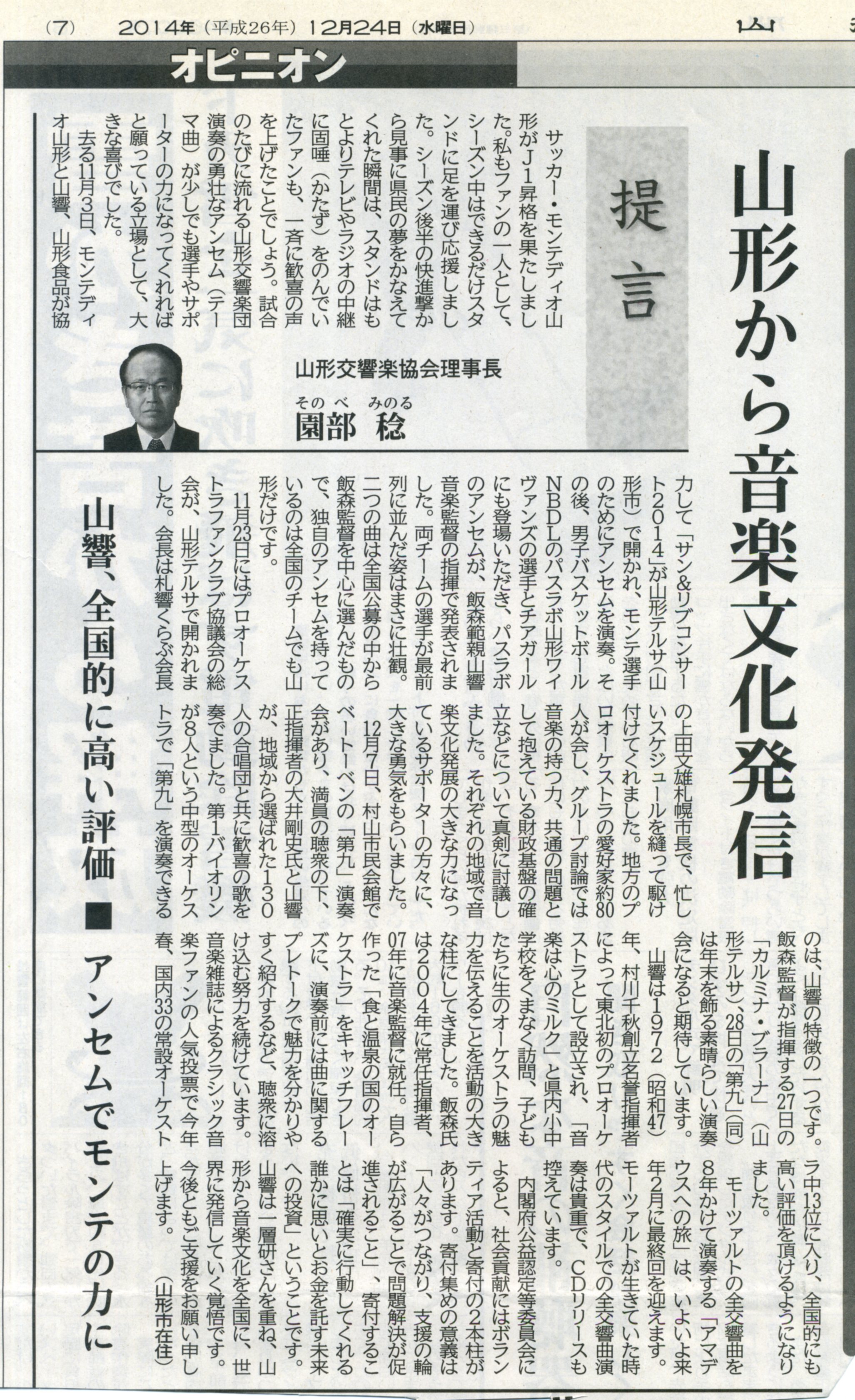 園部 稔君の提言記事 平成26年12月24日の記事 山形県の唯一のプロの交響楽団を抱えて広く活動している「山形交響楽協会理事長」の 役職を担っている園部君による県民への提言記事が山形新聞に掲載された。 その内容を紹介する。