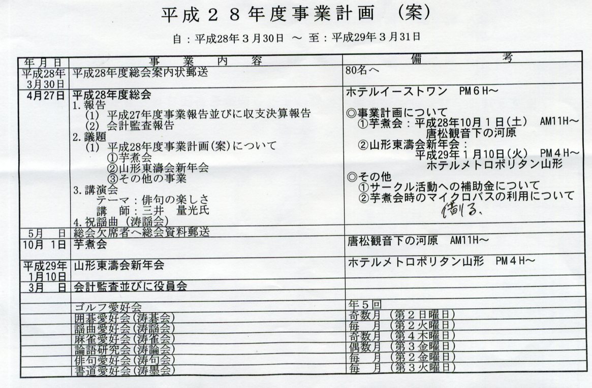 なお当日の資料による山形東涛会の平成28年度の事業計画を示して総会の