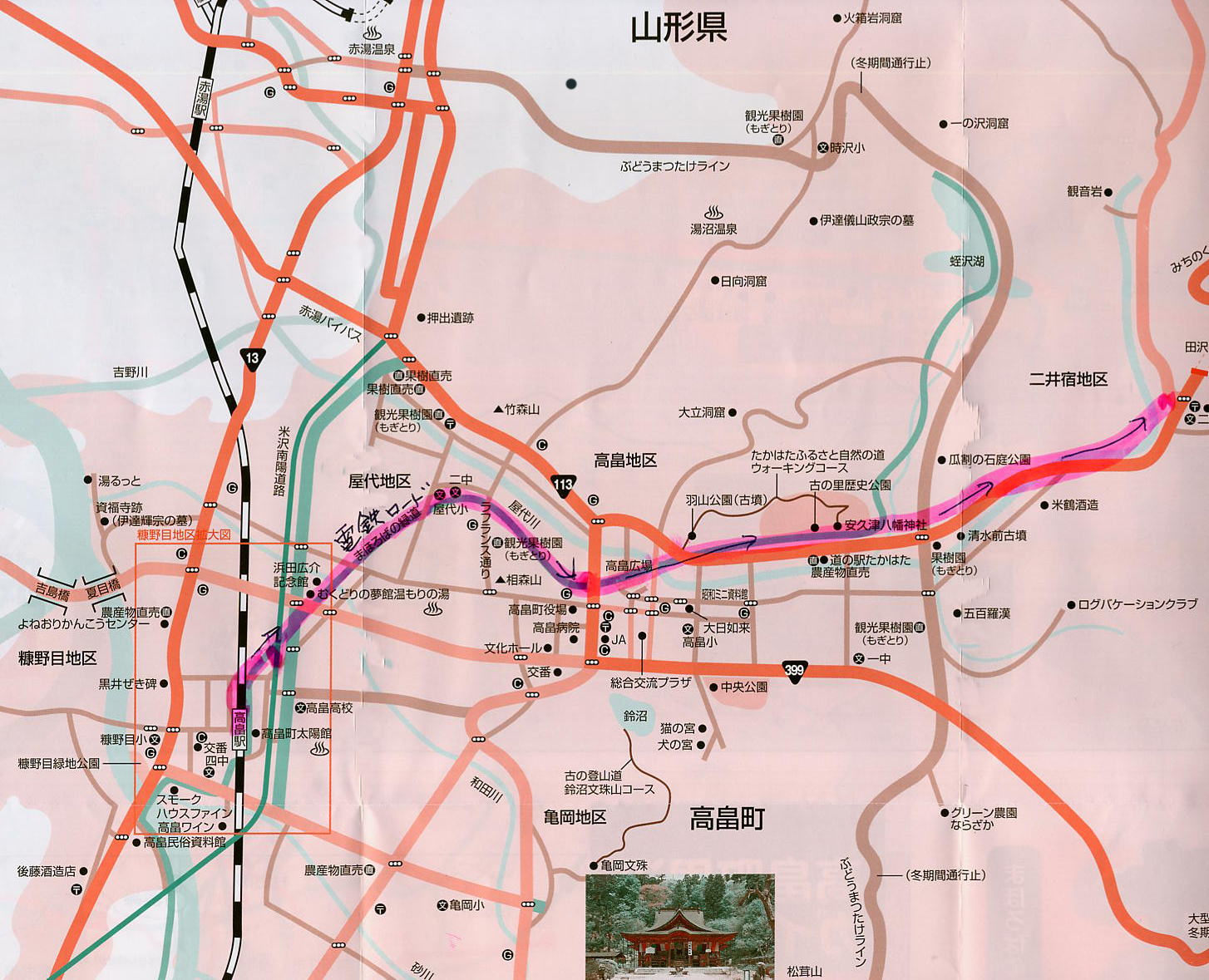 最後に高畠駅が高畠町までの地図を示す。