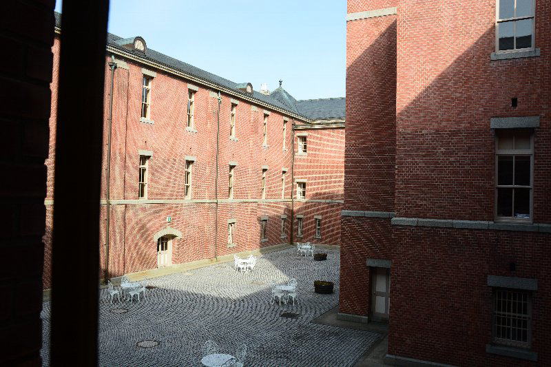ギャラリーまでの廊下から見る中庭。当時のレンガ造りの建物の雰囲気が味わえる