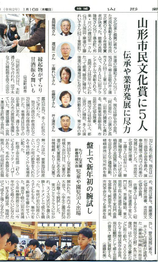令和2年1月16日の山形新聞に山形市民文化賞に5人が決定したと