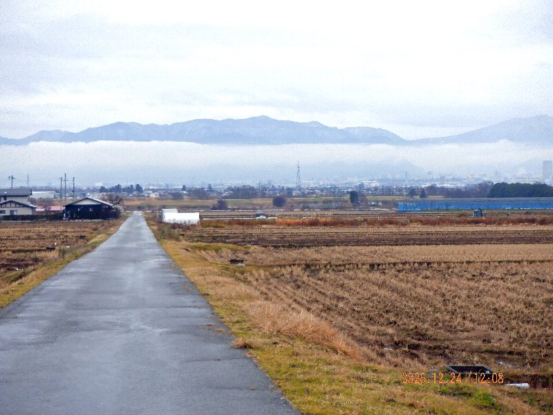 12月24日の光景 田畑に雪の無い様子。山形市上空には雲海が