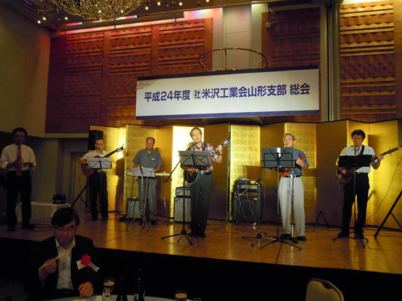 東涛会会員が演奏出演 平成24年7月13日にある団体の総会でアトラクションとして演奏を頼まれ 山形グランドホテルの会場で出演した。 我々の青春時代の曲で構成したがこれが意外にも受けた。 写真を見ても分かるようにリードボーカルは恍惚の状態で歌っている。 我々にとっても楽しい時間でした。 スチールギター 近藤、リードボーカル 園部、ウクレレ 山川、他3名の援助出演