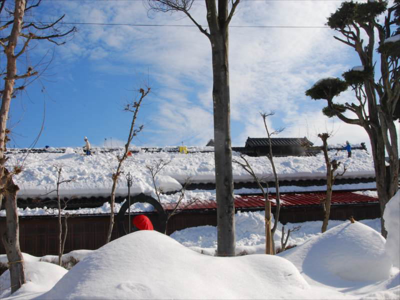今回はドライブの途中にこの宮宿の町で見た雪おろしの光景を紹介する。