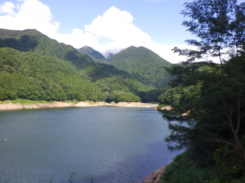 背景の雲の懸かった最奥の山は雁戸山。このダムに入る右側の渓谷の先は